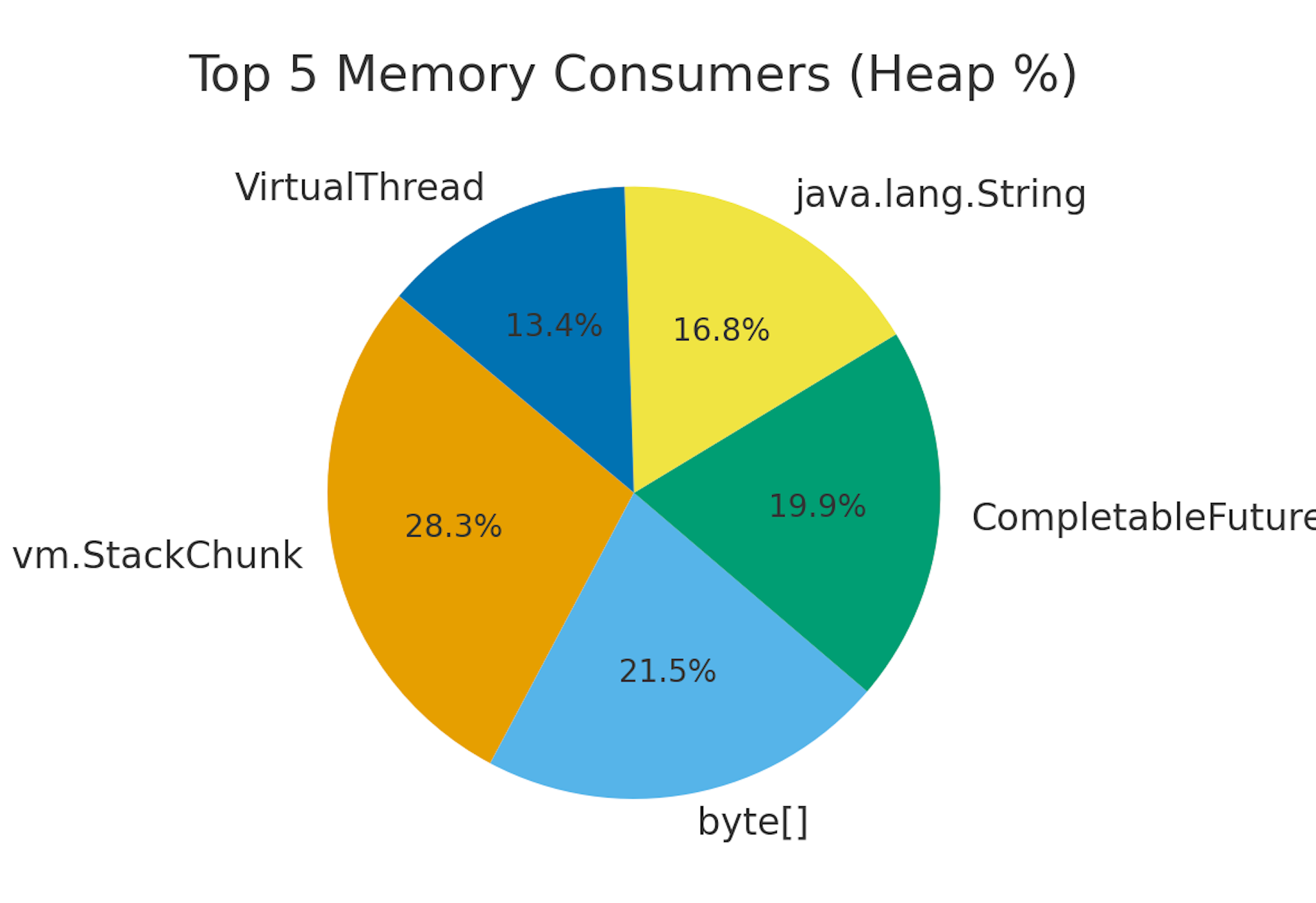 JFR / Heap Live Objects 통계를 통해 분석해 보니, 메모리 점유 양상은 조금 의외였습니다. 처음에는 Virtual Thread 관련 객체들이 메모리의 절반 이상을 차지할 것이라 예상했지만, 실제로는 byte 배열과 String이 더 큰 비중을 차지했습니다. 즉, 생각보다 VT 자체의 메모리 부담은 크지 않았고, 오히려 데이터 처리 과정에서 발생하는 byte[], String 객체들이 주요 원인이라는 점을 확인할 수 있었습니다.
