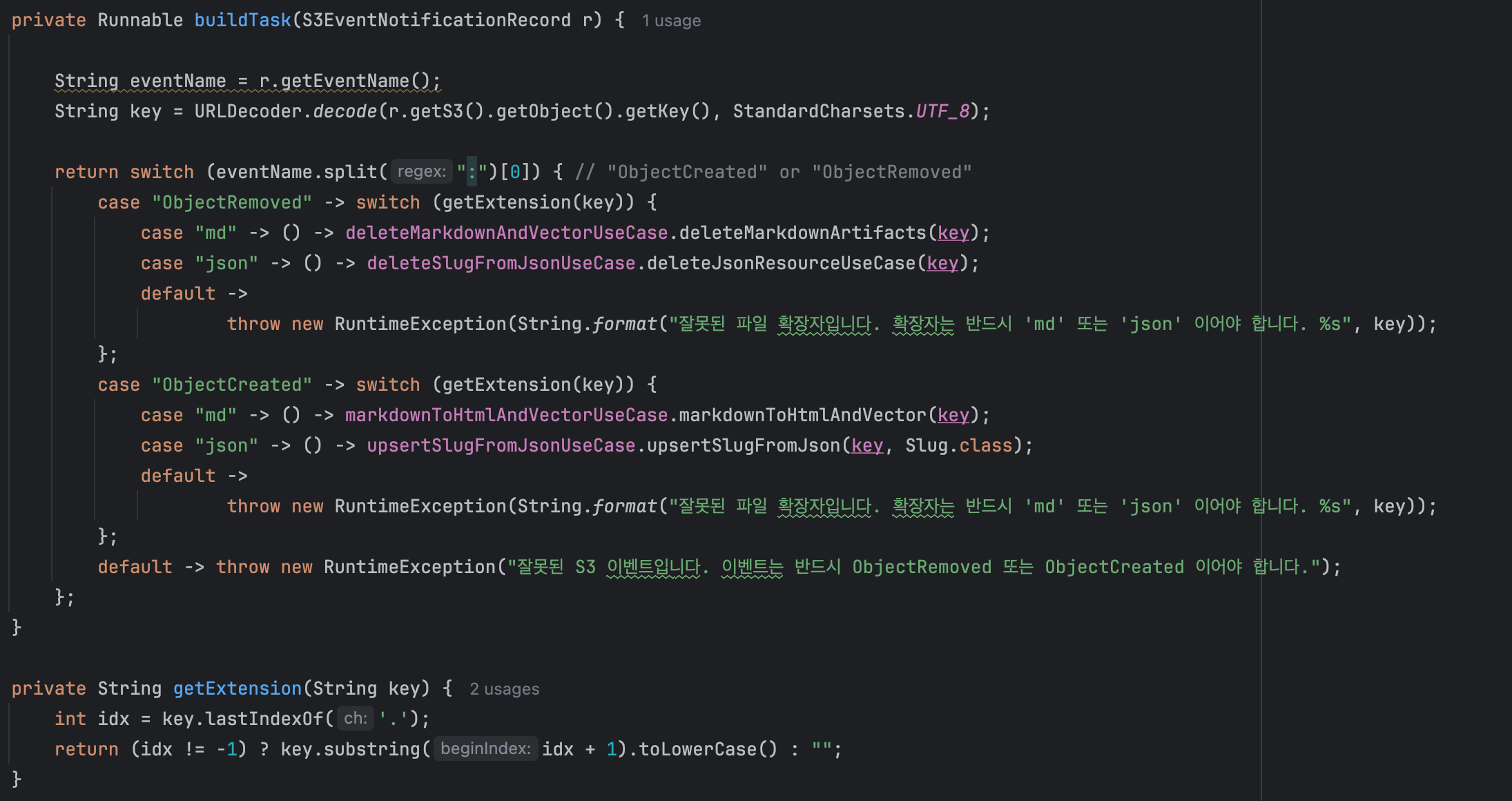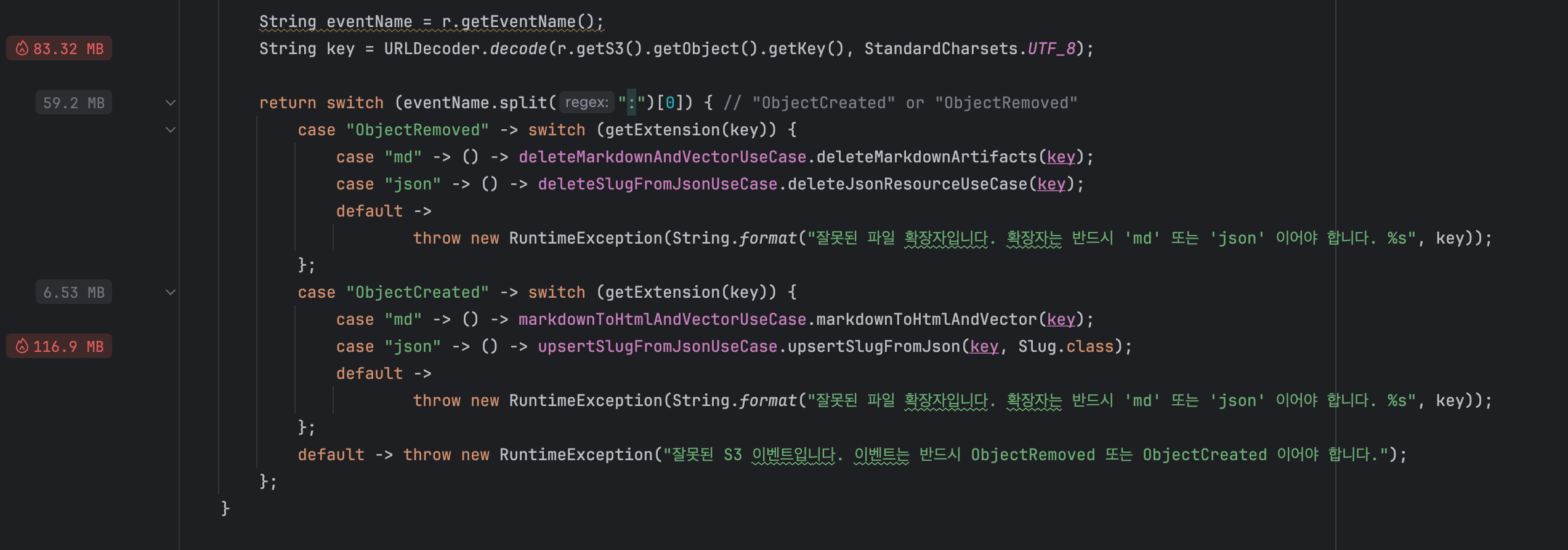 이벤트 유형(ObjectCreated/ObjectRemoved)과 확장자(md/json)에 따라 람다(Runnable) 를 만들어 제출하고, 마지막에 allOf(...).join()으로 전부 끝날 때까지 기다리는 방식이죠, 의도는 단순하게 "레코드마다 비동기로 빠르게 처리하면 되겠지" 였지만 곧 바로 문제가 바로 드러났습니다.