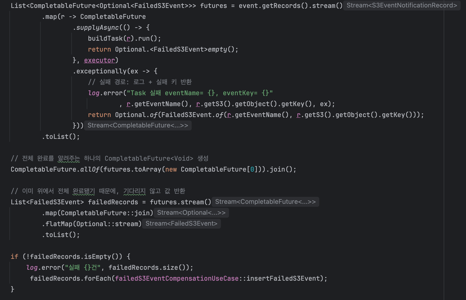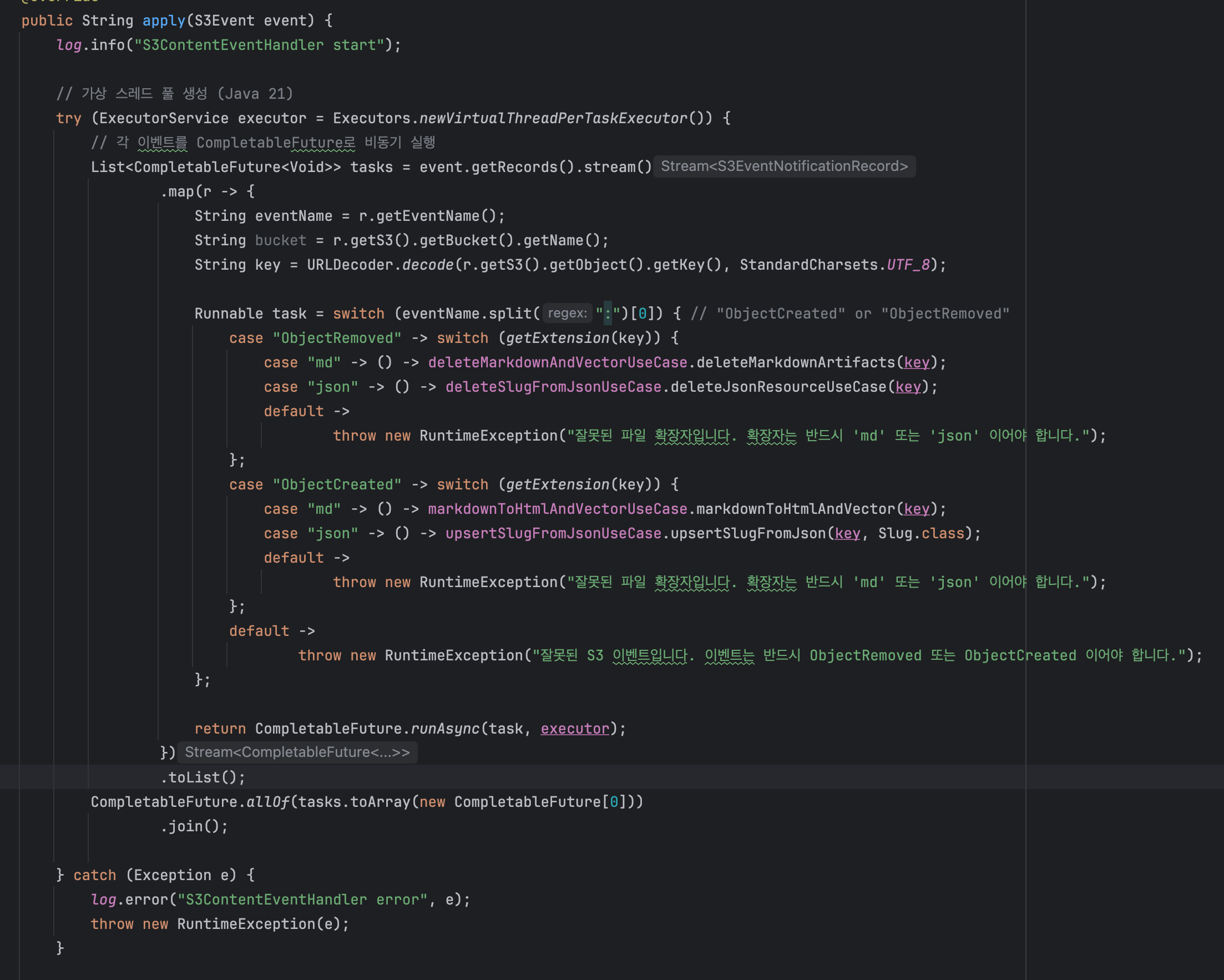 처음 버전은 S3Event의 모든 레코드를 스트림으로 돌리며 각 레코드를 Virtual Thread + CompletableFuture.runAsync 로 비동기 실행하는 구조였습니다.