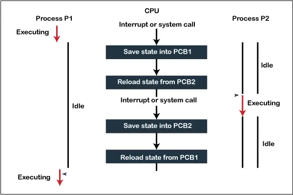 Process1 실행중 -> 인터럽트 발생 -> PCB1저장 -> PCB2리로드 -> Process2실행 의 순서를 나타내며